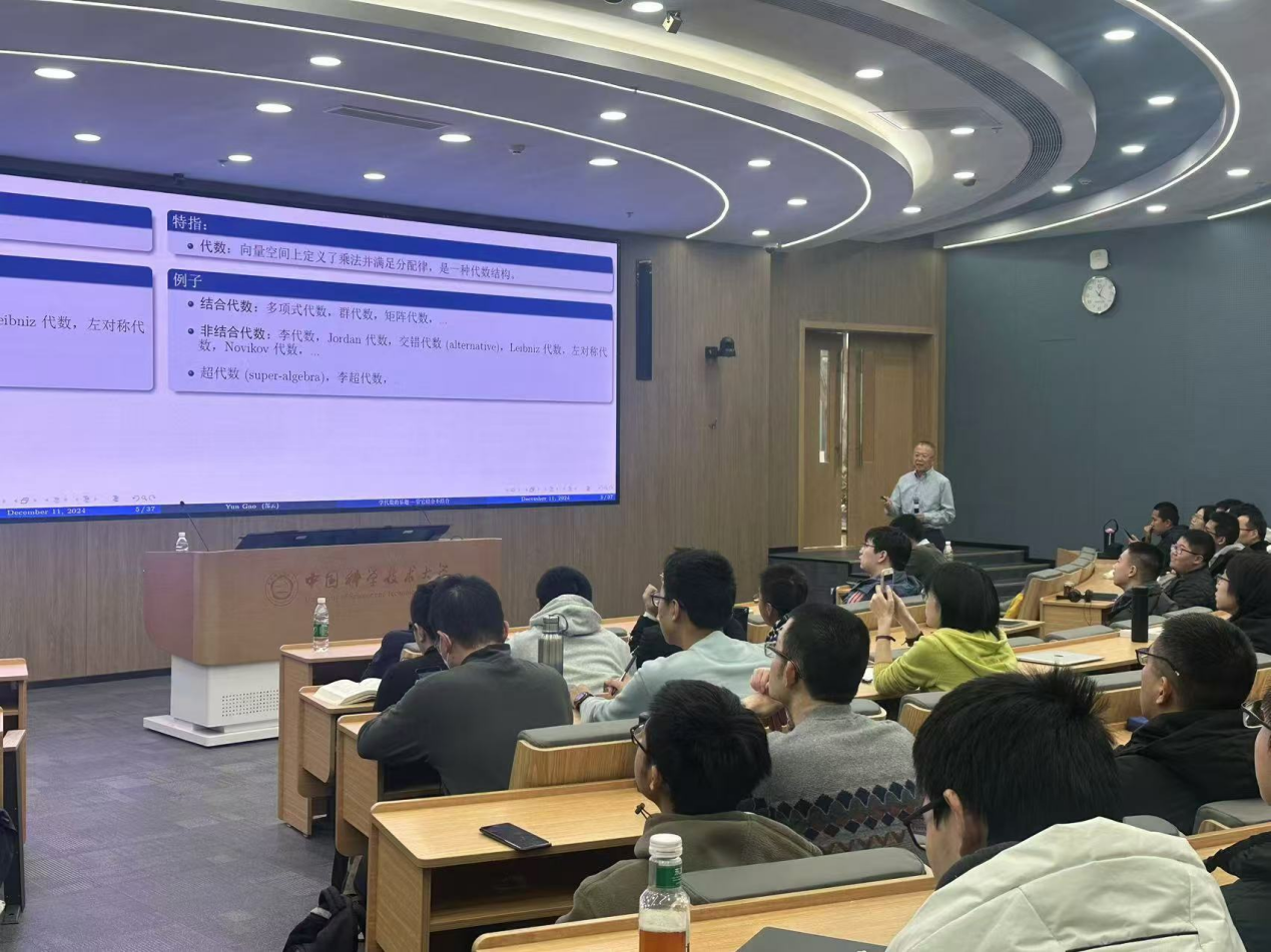 郜云教授从代数在各学科中的作用以及其在日常生活中的广泛应用谈起,指出代数不仅是数学的基础,也是数学与其他学科之间的工具和语言。他以中国剩余定理为切入点,回顾了古代中国在代数领域的卓越成就,并详细讲述了近现代中国数学家在代数研究方面的突出贡献。随后,他进一步分析了代数的不同类型,基于是否具备结合律与交换律对代数进行分类,并引入了李代数、Jordan代数和交错代数等非结合代数。通过讲解四元数的基础,他还引入了八元数,加深了同学们对代数结构的理解。最后,郜云教授深入讲解了Hurwitz定理,探讨了赋泛可除代数在同构意义下的分类,并详细介绍了李代数的Dynkin图,以及复数域上单李代数的分类,为同学们提供了前沿的学术视角。