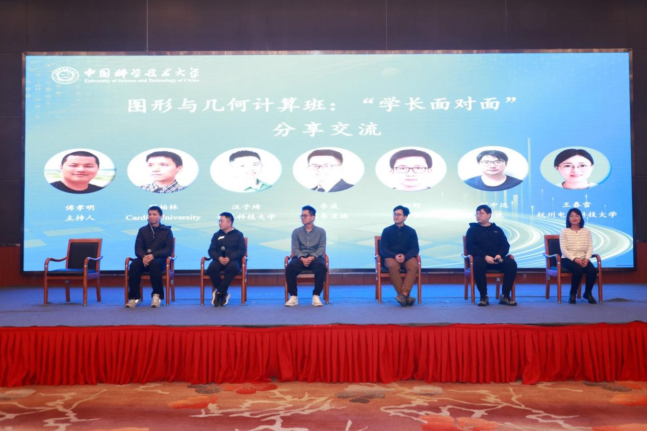 随后,傅孝明主持了“图形与几何计算班:学长面对面”的分享交流研讨会。研讨会邀请了相关老师与实验室优秀毕业学长向在校同学分享宝贵的求学经验与职业发展心得。交流会上,学长们结合自身经历,就如何平衡科研与生活、如何选择未来发展方向等话题展开深入讨论,分享了他们在学术探索和项目实践中积累的经验,并耐心解答了在场同学们的提问。这次互动让同学们不仅获得了丰富经验,还得到了宝贵指导和启发。
