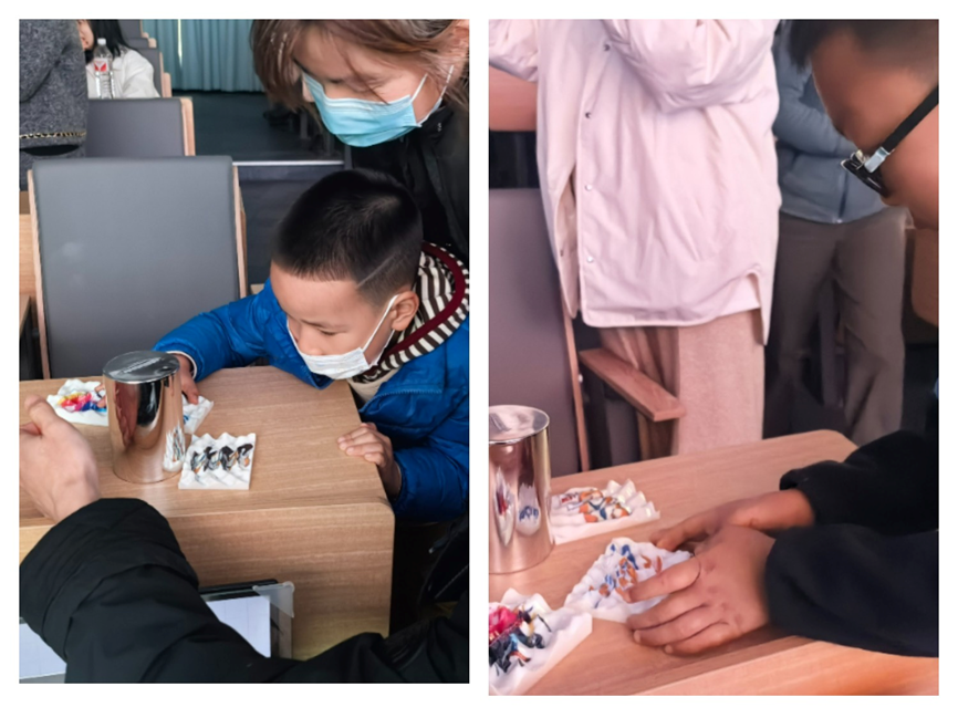 第二场讲座中,吴康博士后为大家展示并介绍了镜杯碟艺术。镜杯碟是一种独特的艺术设计形式,其碟子形状经过特殊设计,当透过镜杯观看时,碟子上呈现出的图案与直接观看时截然不同。在动手实践环节,孩子们饶有兴致地亲自操作,通过调整碟子的方向,在杯子上观察到了各式各样变化奇妙的图案,直观感受到镜杯碟艺术的独特魅力 。