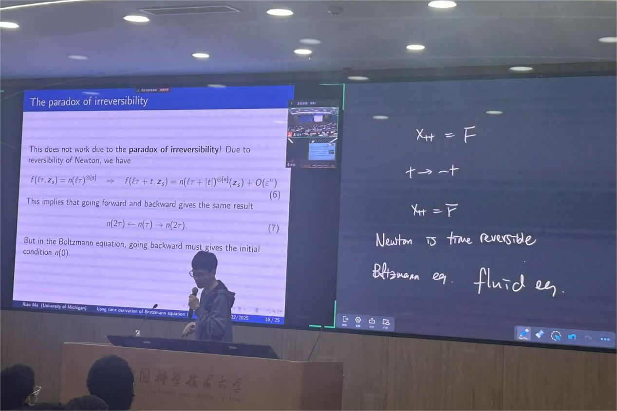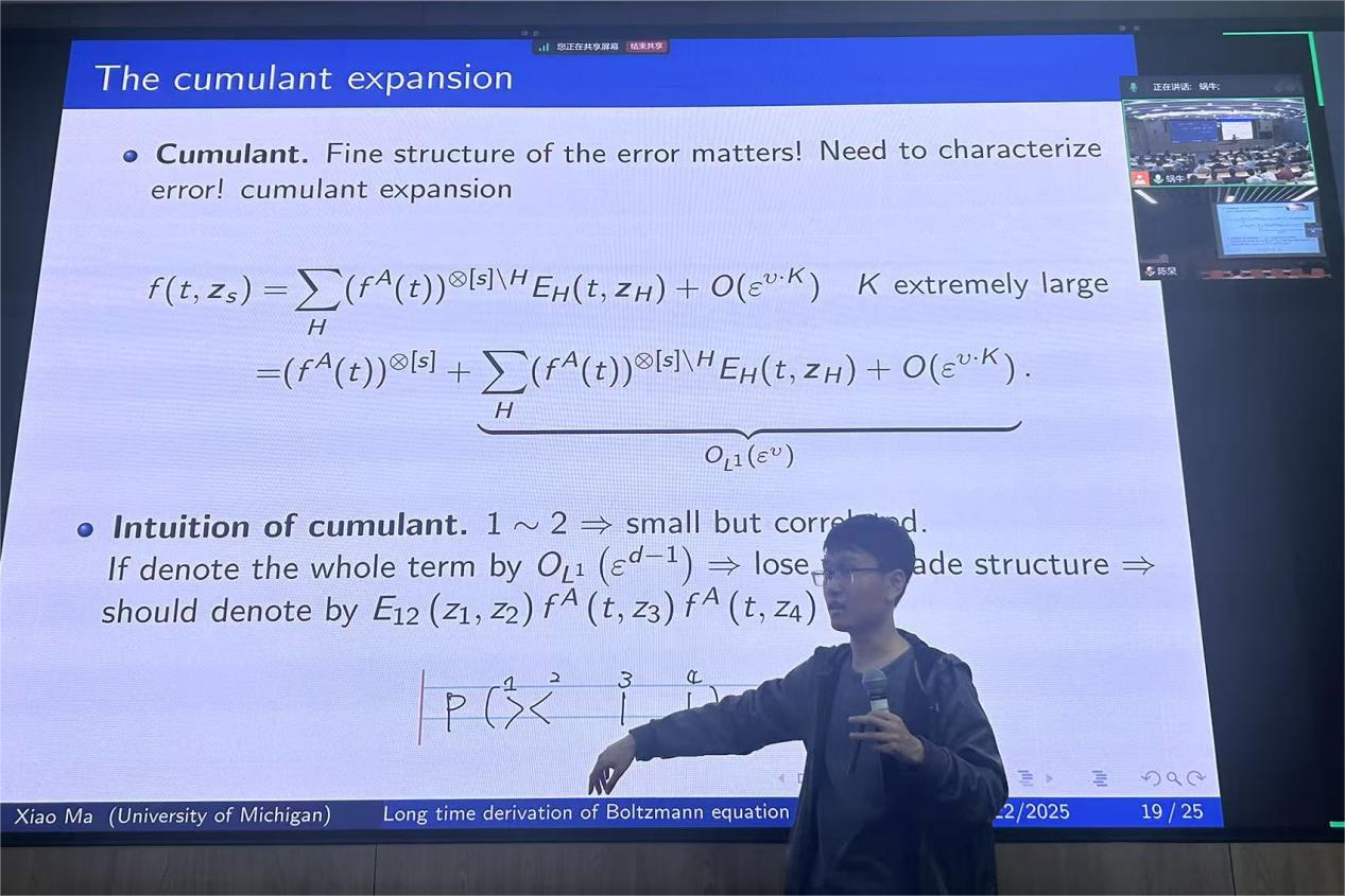 马骁从物理学基本原理切入,说明了物理公理化的必要性。他先阐述离散硬球系统,即存在N个具有无限势能的小球,借助牛顿力学推导出该系统所满足的方程。当N趋向于无穷时,期望相应方程能契合连续的波尔茨曼方程。随后,马骁介绍了这类问题的相关历史及已取得的部分成果。他指出,其中的关键在于当N增大时,对“碰撞”间复杂度的估计与把控。马骁表示,其团队所开展的工作并非精妙的分析学,而是运用“费曼图”工具刻画其中蕴含的物理学。基于这一发现,他们得以将问题简化为图论的组合分析,并且能够通过小概率事件的精细结构来区分时间箭头。