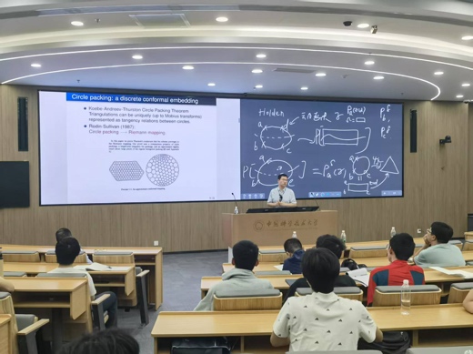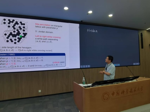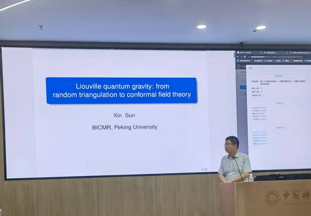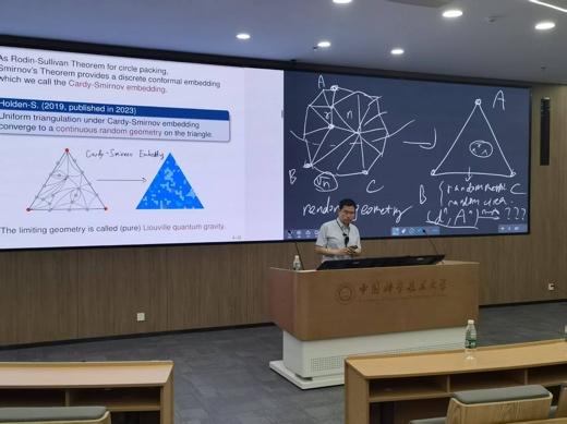 孙鑫教授首先通过六边形格点上的渗流模型出发引入随机几何。接着通过圆堆积问题讲述了黎曼映照的离散逼近,从而引出孙鑫教授与合作者最近发表在Acta Math上的重要研究成果:三角形区域上的一致三角剖分收敛到三角形上的某种连续随机几何。之后孙鑫教授简要介绍了黎曼流形上的高斯自由场和刘维尔量子引力。最后孙鑫教授介绍了刘维尔量子、SLE曲线与KPZ关系,以及在统计物理模型中的应用。