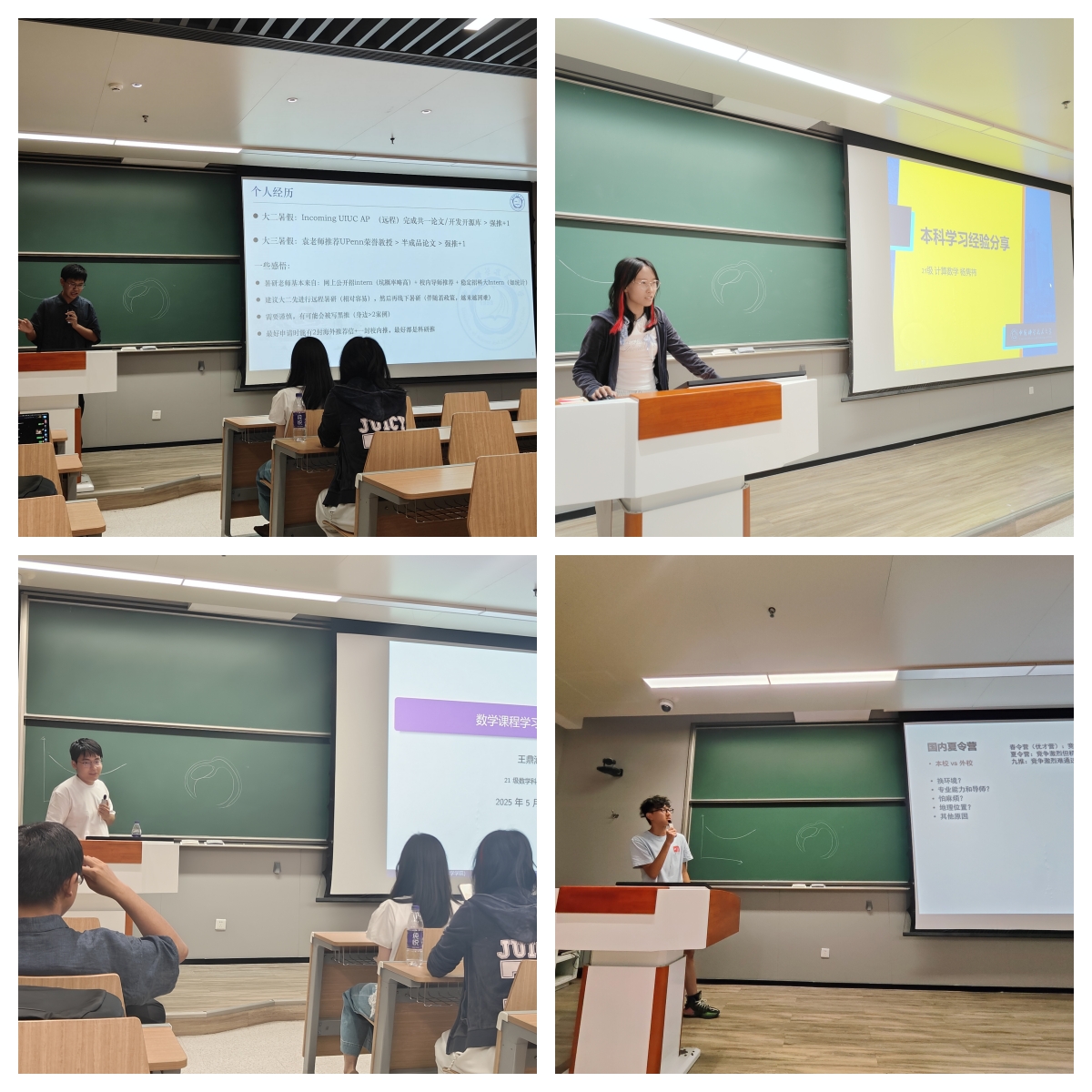 四位优秀学子分别结合自身经历,分享了在学业、科研、保研及出国申请等方面的宝贵经验。王鼎涵同学着重分享了基础数学方向的课程学习经验,为有志于基础数学研究的同学们提供了清晰的学习路径和方法。杨益同学本科期间便发表多篇顶会文章,他详细分享了出国申请的经验以及科研入门指南,从选校、文书撰写到科研项目的参与和成果展示,为同学们带来了全面且实用的建议。