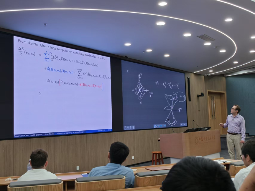报告围绕最优传输先验估计的几何方法展开,系统阐释了支撑最佳运输问题的规则性不等式理论。该理论适用于满足Ma-Trudinger-Wang条件的成本函数(即Pogorelov二阶导数界),并进一步推导为光滑最优映射的先验内部 C¹ 估计。McCann教授在报告中详细介绍了这一估计的全新推导过程及理论基础,并分享了其灵感来源——当源域与目标域的乘积空间赋予特定伪黎曼几何时,最优映射的图形可视为体积极大化的时空子流形,这一几何结构巧妙融合了边际密度与成本函数的特性。