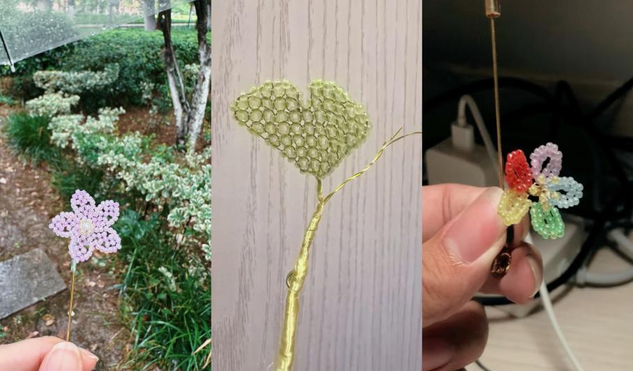 大家眯着眼,皱着眉,小心翼翼地穿针引线,排列直径仅两毫米的米珠。珠与珠之间巧妙串联,红、粉、黄、白、绿各色交织,在传习室柔和的光线下闪烁着温润的光泽。起初还不时传来珠子掉落、铜线扯断、“笨手笨脚”的同学叹气的声音,但经过不断尝试以及老师的亲身示范,大家逐渐掌握了要领。虽耗时费神,可随着每一个细小的部分完成,花朵、叶片逐渐在手中成型,有淡粉的樱花、金黄的银杏叶,还有别出心裁的异色花瓣。近3小时的埋头制作后,每个人都拥有了自己的辑珠胸针。