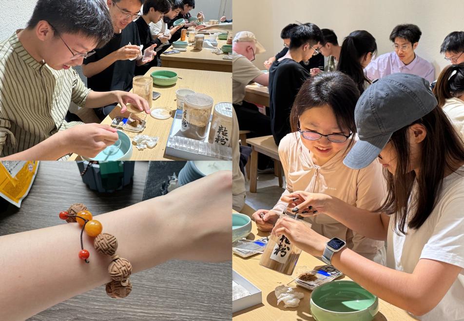 传统手工艺文化中蕴含的科学机理和人文哲思令人回味不尽,吸引着同学们不断探索、尝试。上月,星空(中国)团委联系档案文博院精心组织了三场“博物传习”之传统合香珠手串制作活动,班级也有十余名同学积极参加,大家亲手研磨配伍香粉,以古法醒香泥,塑珠胚,阴干合香珠后串联成萦绕腕间的馨香。