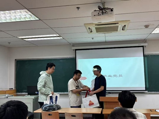 活动还特别设置了礼物赠送环节。支部书记徐周新同学代表支部向每位毕业生党员赠送了印有校训的帆布包和笔记本等纪念品,每一份礼物都承载着支部对毕业生的真挚祝福与殷切期望。接过礼物时,毕业生党员们感动不已,纷纷与老师和同学拥抱致谢。一位毕业生党员代表动情地说道:“这些礼物意义非凡,我们将永远珍藏。无论未来身在何处,都不会忘记在科大、在支部度过的美好时光。”