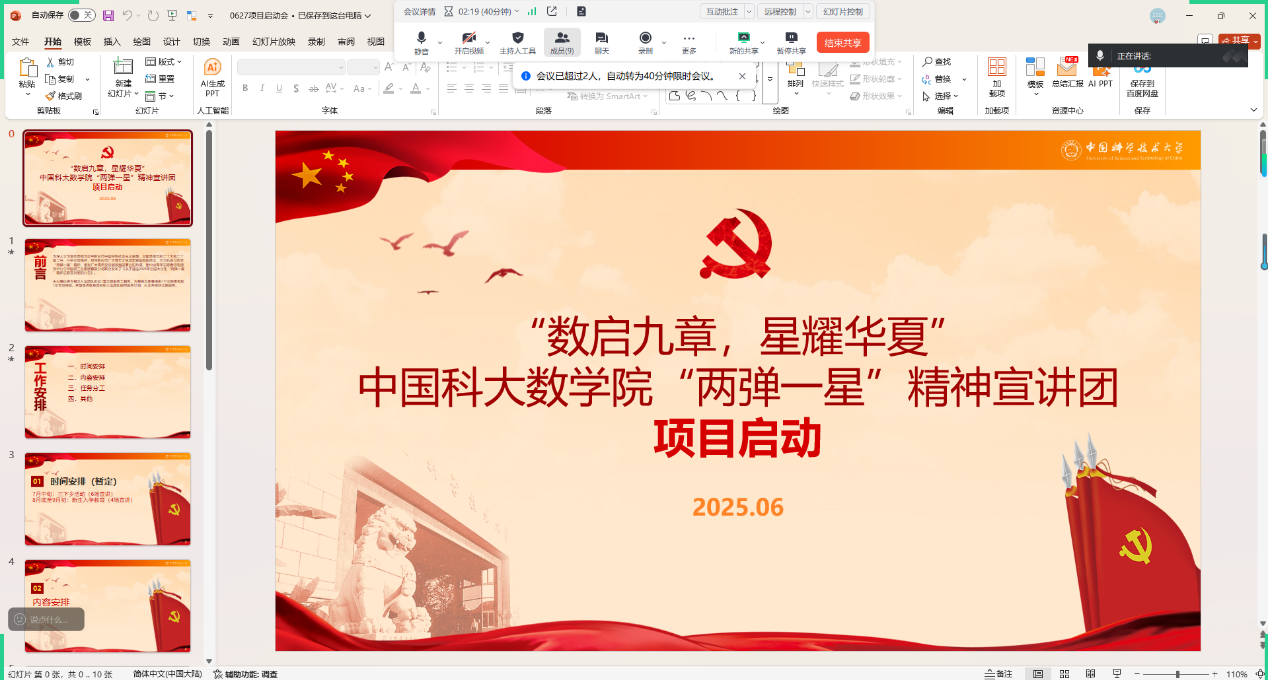 为弘扬“两弹一星”精神,传承老一辈科学家的家国情怀与奉献精神,6月27日晚,“数启九章,星耀华夏”中国科大数星空(中国)“两弹一星”精神宣讲团召开了线上启动会。会议由宣讲团团长沈妍同学主持,指导老师王瑞标及宣讲团11名成员(7名本科生、4名研究生)共同参与。