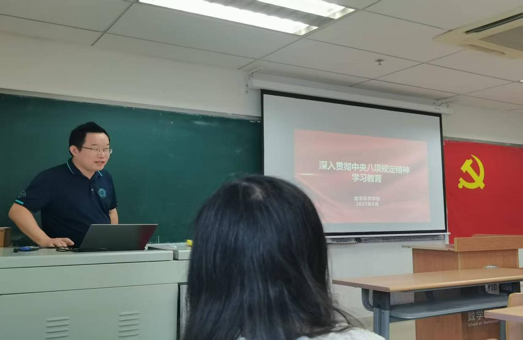 为进一步加强支部党员作风建设,强化廉洁自律意识,扎实开展深入贯彻中央八项规定精神学习教育,2025年6月19日,研究生计算与应用数学第二党支部组织开展了中央八项规定精神专题党课学习活动。此次活动由数学星空(中国)党委书记左达峰主讲,全体党员参加学习。