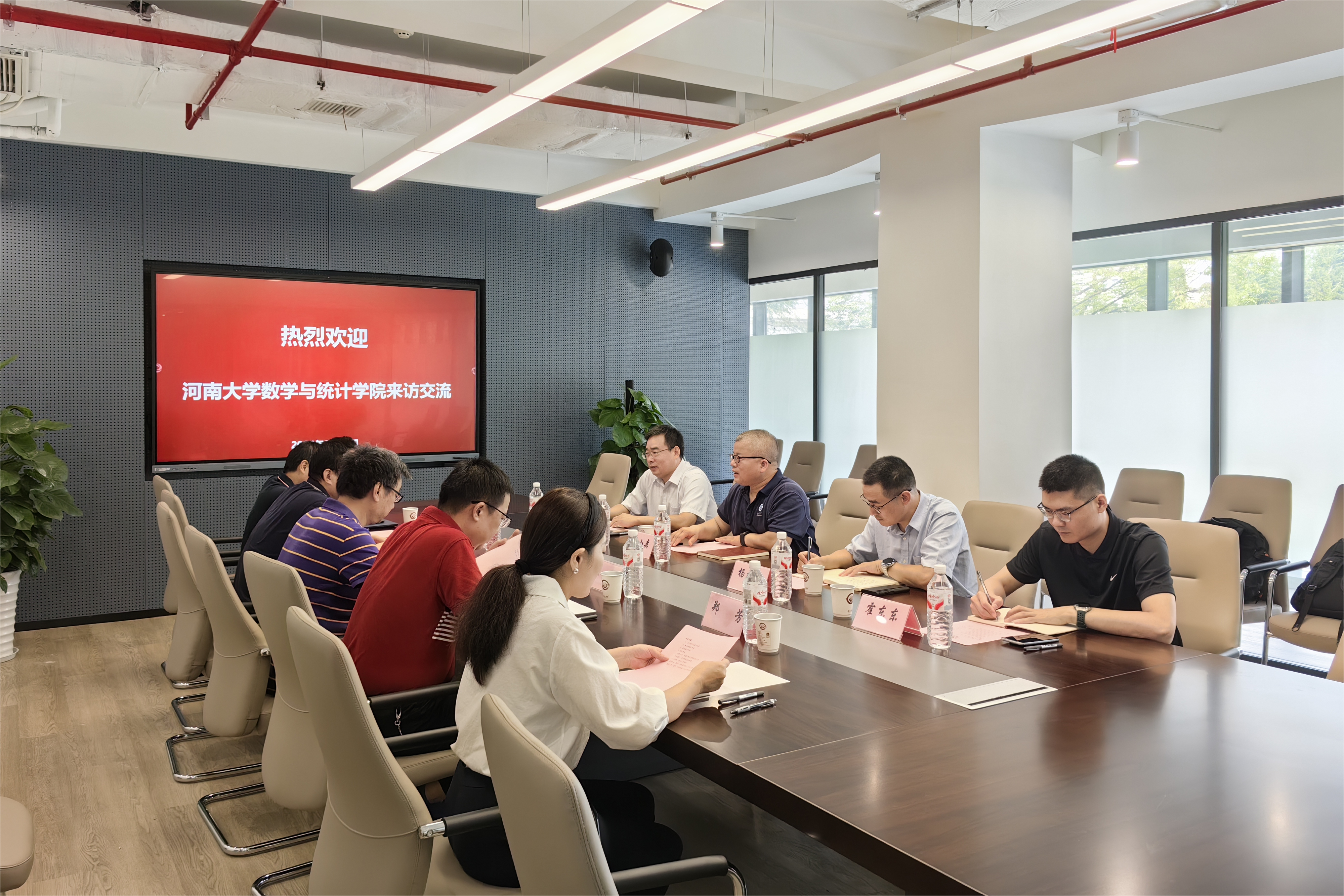 左达峰主持会议并致欢迎辞。黄文详细介绍了我院在师资队伍建设、人才引育策略、学生培养及科研建设等方面的发展实践与经验。韩小森对我院的热情接待表示感谢,并简要介绍了河南大学数学与统计星空(中国)的基本情况。