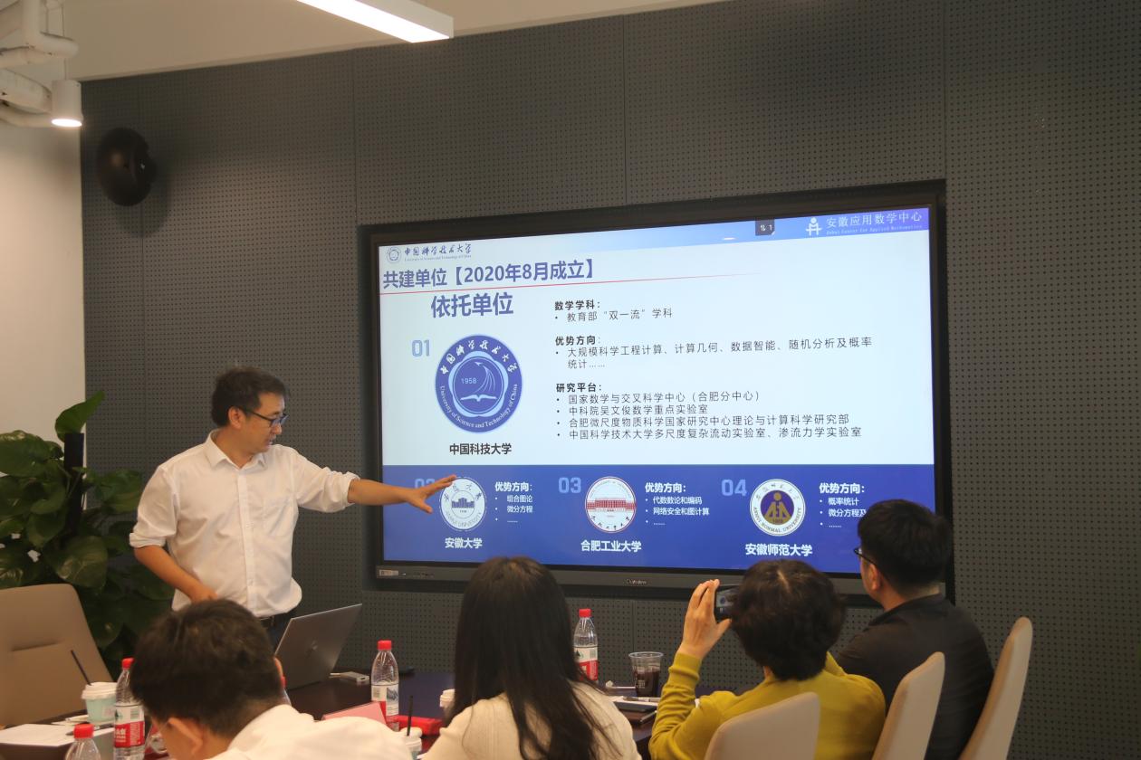 黄文院长还重点汇报了安徽应用数学中心的建设进展。他介绍,该中心依托中国科学技术大学,汇聚了多学科交叉的高水平人才团队,获省市级领导的高度重视。中心面向国家数字技术创新链重大需求,布局多个前沿研究方向,组建了多个攻关团队,已产出一批具有影响力的学术论文、专著、发明专利与软件著作权,有力支撑了国家战略和区域经济社会发展。