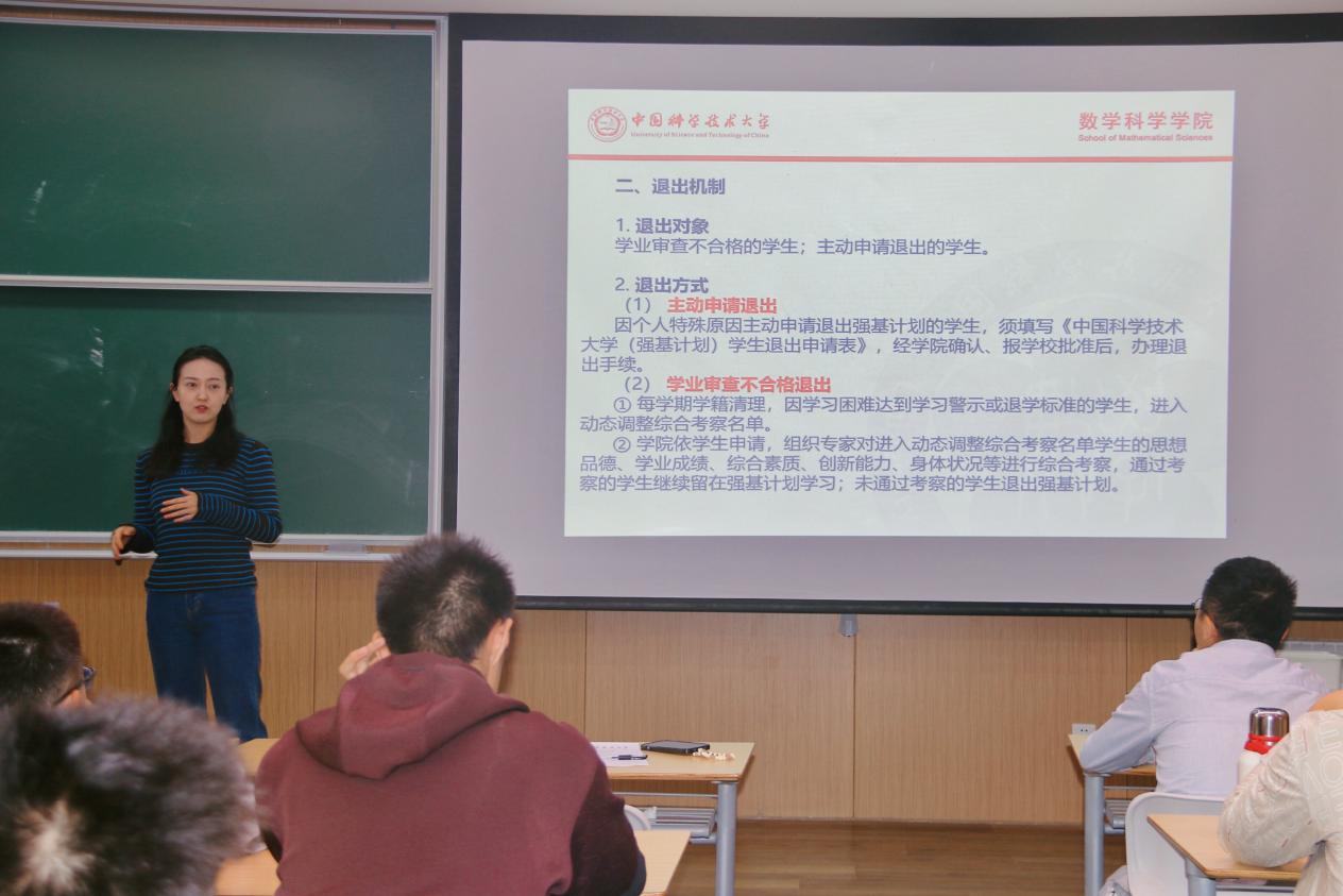 座谈会上,强基计划教学秘书吴笛老师首先为同学们系统解读了强基计划的培养方案、激励机制及动态调整政策。她详细介绍了课程设置、培养方案、转段流程等政策,鼓励同学们积极参与学科竞赛,在实践锻炼中夯实数理基础,拓宽学术视野。
